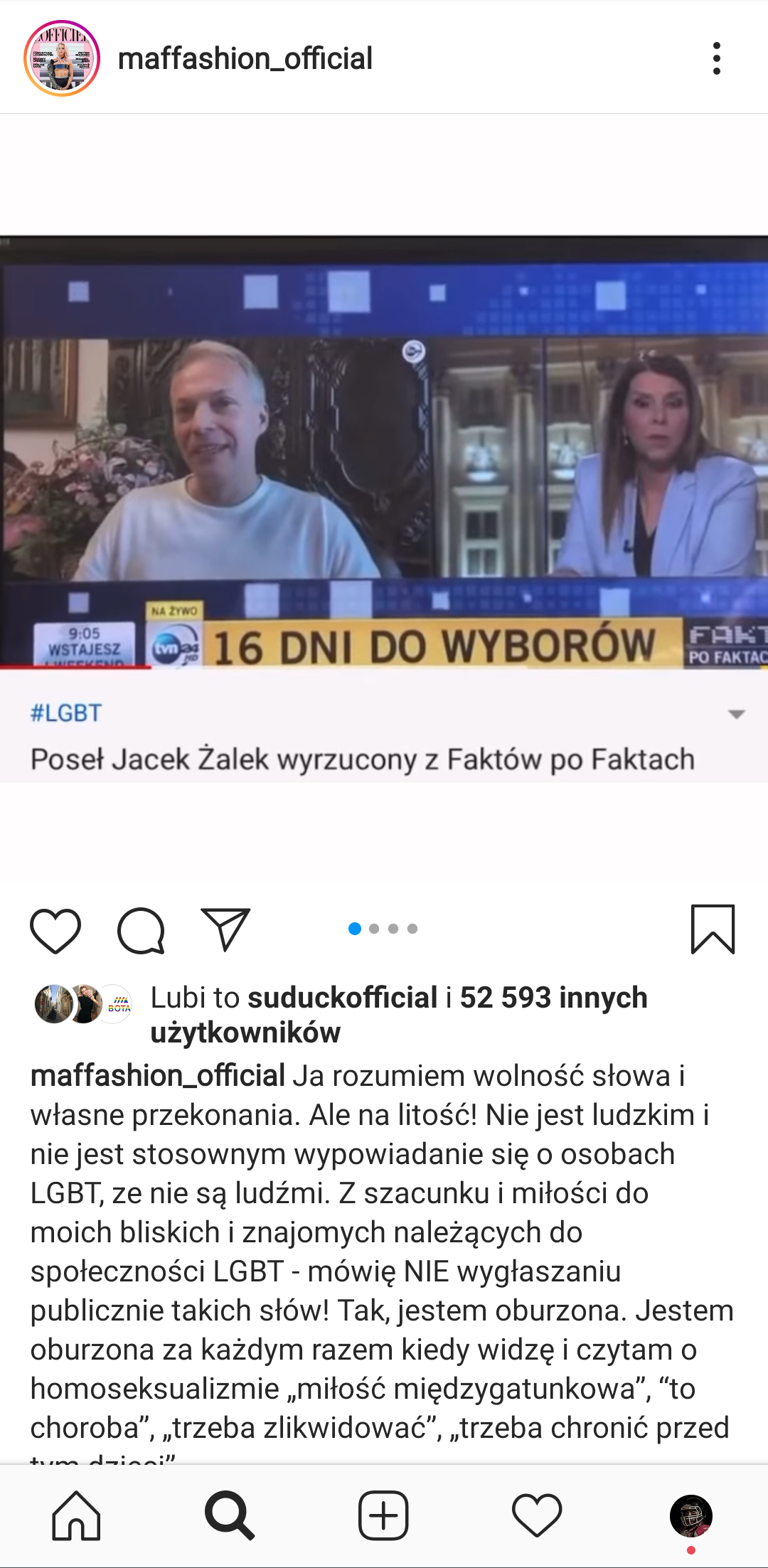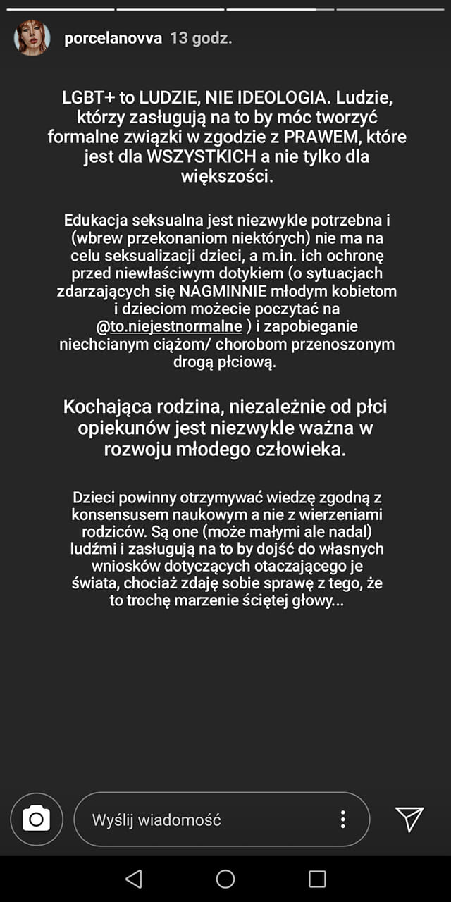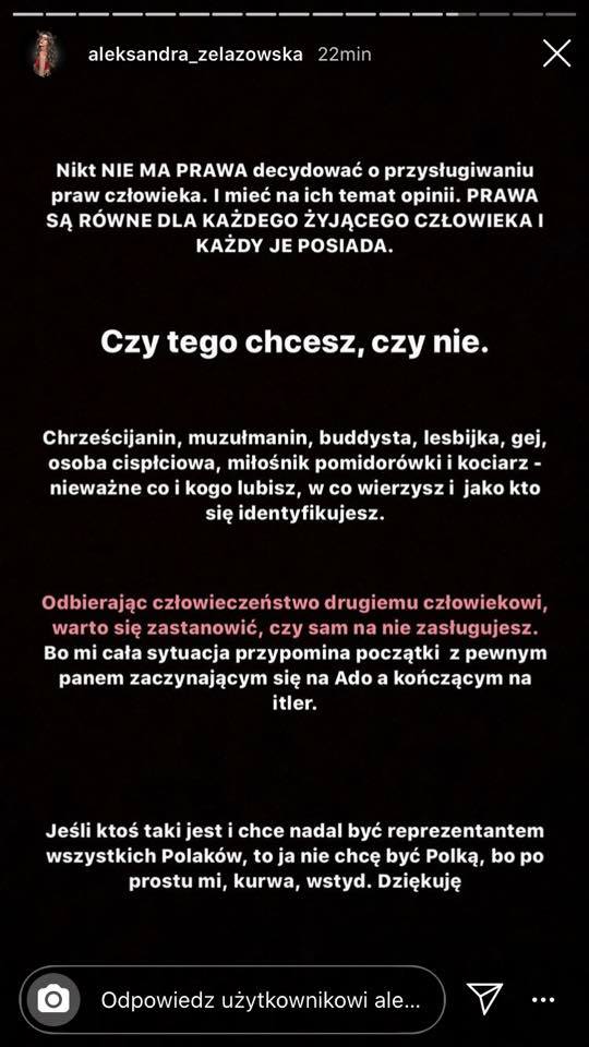 Jestem tez w pełni świadoma medialnych manipulacji, rozumiem kreacje i polityczne powiązania. Ale takie słowa, taka ignorancja pojawia się z każdej strony. - pisze w swoim poście modowa blogerka, którą na Instagramie obserwuje ponad 1,3 mln osób.