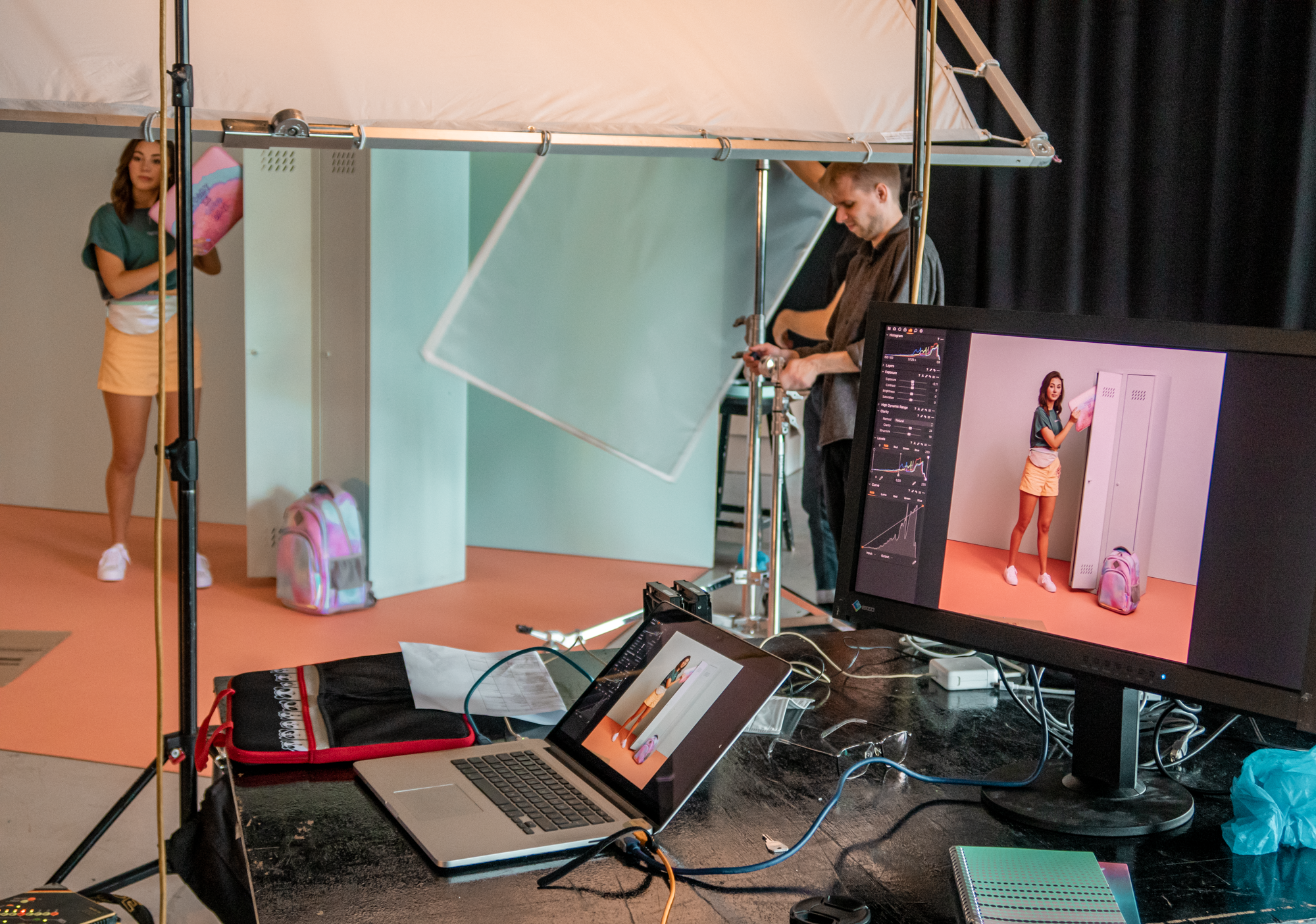 Zapewnie niektórych ciekawi o co chodzi z monitorem. Śpieszymy z wyjaśnieniem - na każdej profesjonalnej sesji komputer i monitor to mus. Ekipa obecna na planie musi mieć możliwość bieżącego podglądu na efekty swojej pracy. Wielu rzeczy nie da się wychwycić na malutkim ekranie aparatu.