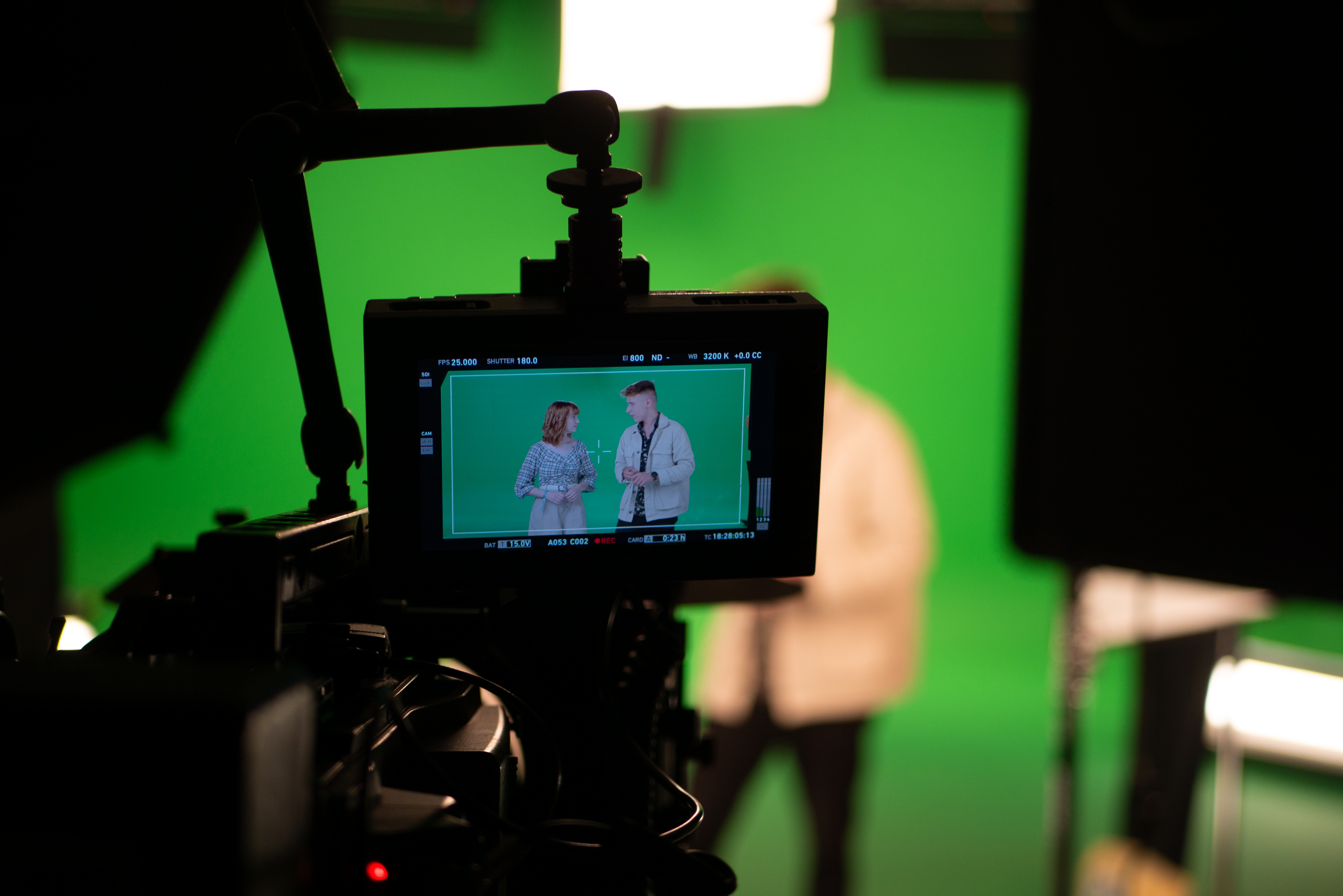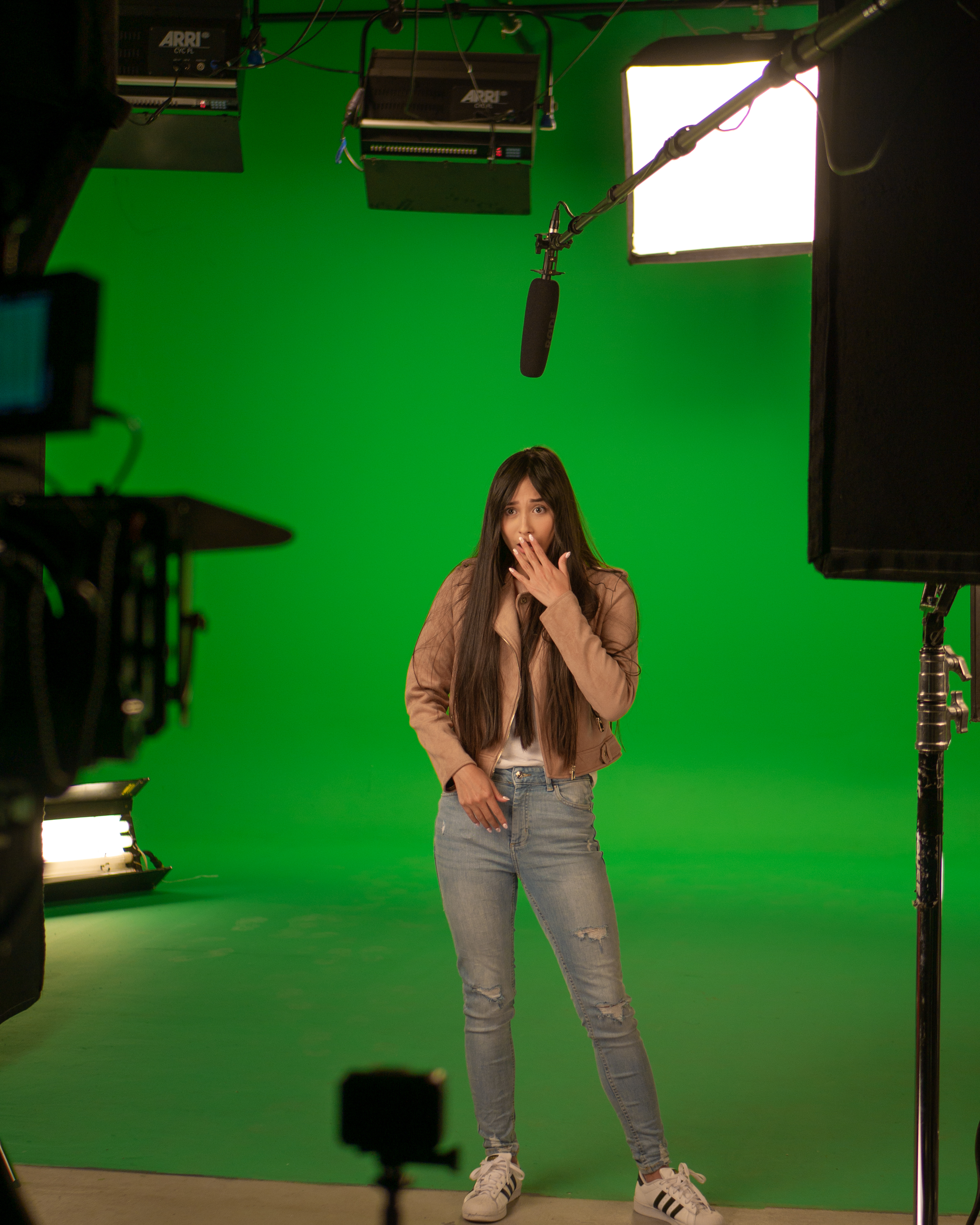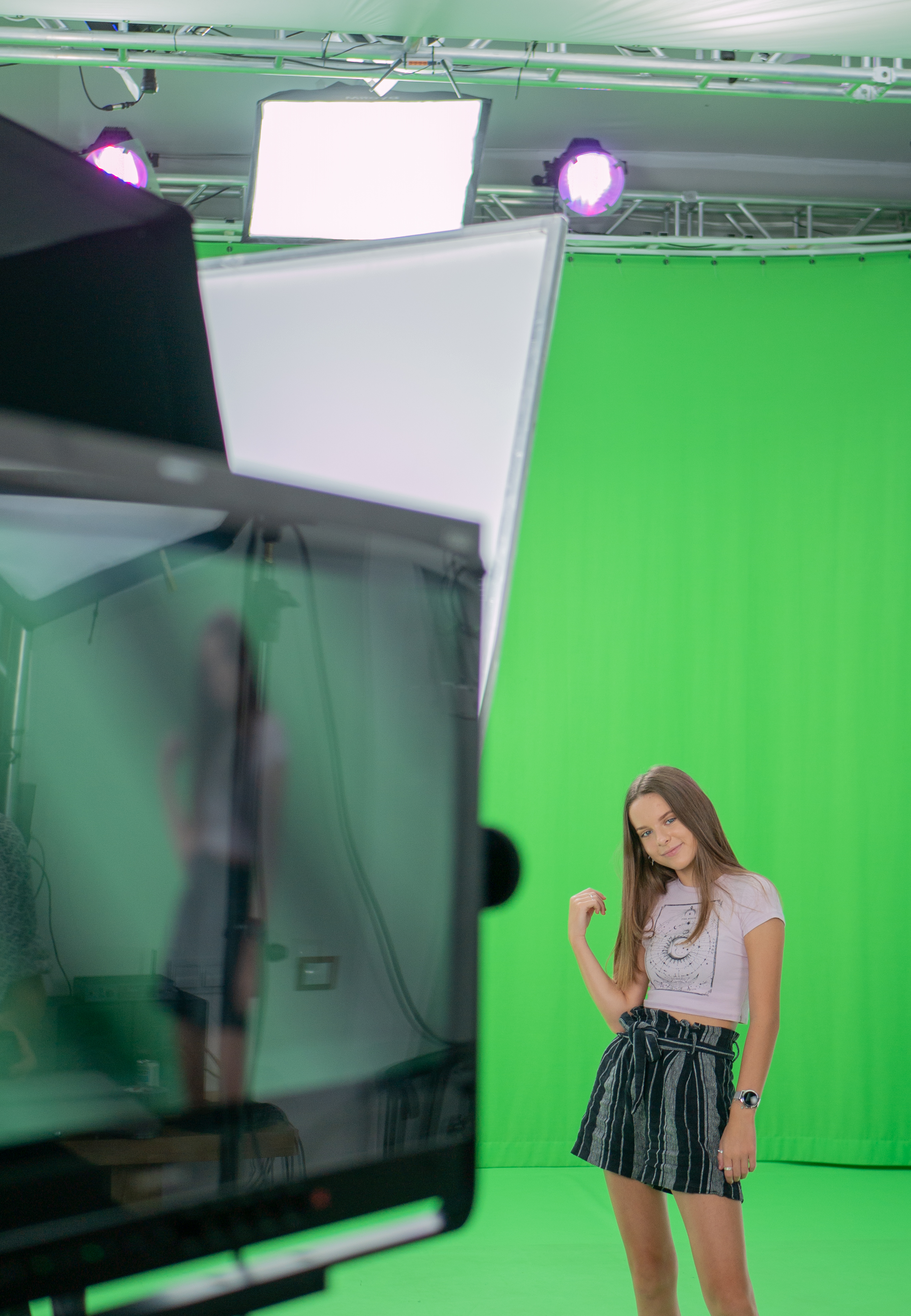 W tym momencie osoba występująca ustawiana jest na zielonym tle, a na podłodze nakleja się tzw. marker, czyli kilka kawałków taśmy, którymi wyznacza się granice, w których można się poruszać. Służy to temu, aby nie wyjść z pola ostrości kamery. Jeżeli np. podejdzie się zbyt blisko i można stać się niewyraźnym (a nie występujemy przecież w reklamie leków na przeziębienie, heee)