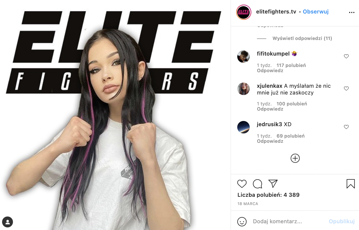 Julia Pelc znana szerszej społeczności YouTube jako Queen of the Black będzie walczyć w federacji Elite Fighters. Ta młoda youtuberka zasłynęła z kontrowersyjnych treści dotyczących tatuaży oraz jej pobytu w szpitalu psychiatrycznym. Elite Fighters to nowa organizacha walk freakowych, z tego wzlęgu niewiele o niej jeszcze wiadomo. Innymi uczestnikami tej federacji będą: Ewa Piekut (uczestniczki Warsaw Shore), Bodychrist (wokalista, youtuber) oraz Maciek Szcukiewicz (uczestnik Warsaw Shore).