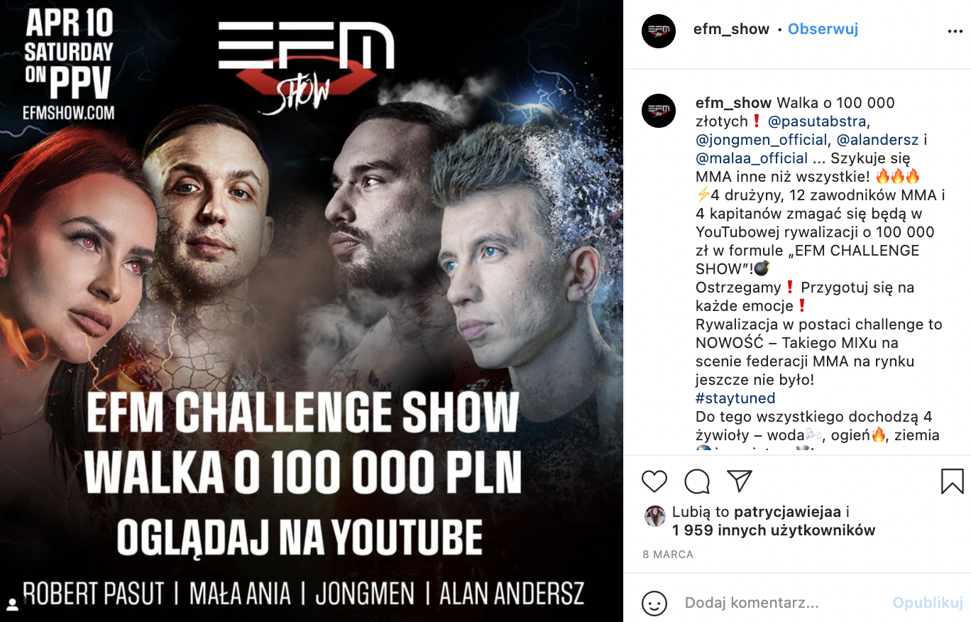 Robert Pasut z kanału Abstrachuje i raper Jongmen tworzą wspólnie galę EFM SHOW, która będzie mieć miejsce 10 kwietnia. Jednym z inwestorów federacji jest Michał Materla – legenda KSW. W walkach wezmą udział zawodnicy tacy jak: Akop Szostak, Radosław Słodkiewicz, Maciej Różański oraz Michał Pasternak. Robert Pasut wraz z Alanem Anderszem (aktor) oraz Małą Ania (uczestniczka programu Warsaw Shore) zostaną kapitanami zespołów składających się z zawodników biorących udział w gali. Na kanale YouTube będą brać udział w challenge’ach m. in. jedzenie pizzy z robakami. Pierwszy odcinek jest już dostępny na kanale EFM SHOW. Finalnie będą emitowane cztery odcinki, w których drużyny będą ze sobą rywalizować. Ekipa, która wygra challange, zdobędzie do podziału sto tysięcy złotych.