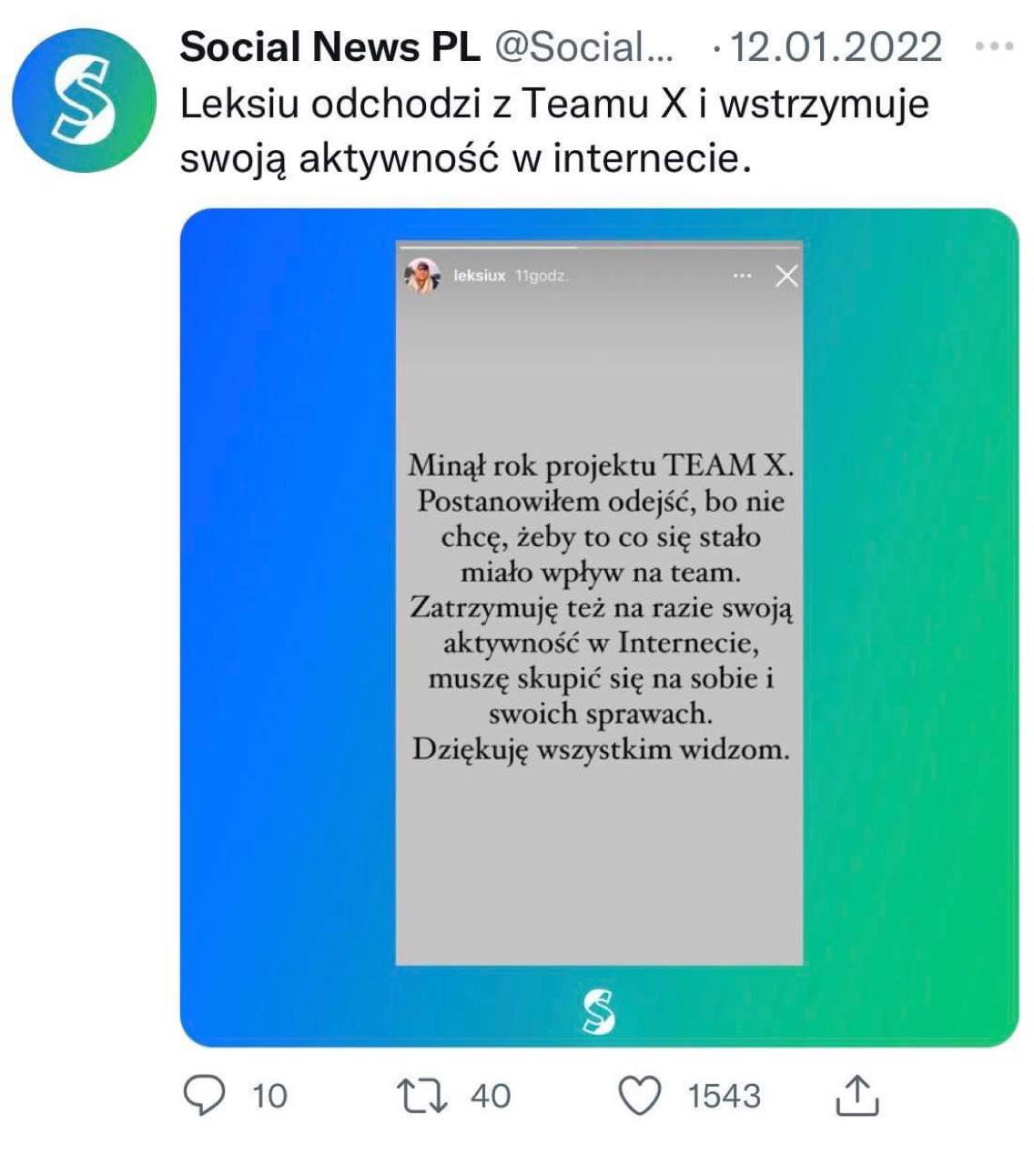 Minął rok projektu TEAM X. Postanowiłem odejść, bo nie chcę, żeby to, co się stało, miało wpływ na team. Zatrzymuję też na razie swoją aktywność w Internecie, muszę skupić się na sobie i swoich sprawach - poinformował Leksiu na InstaStories.