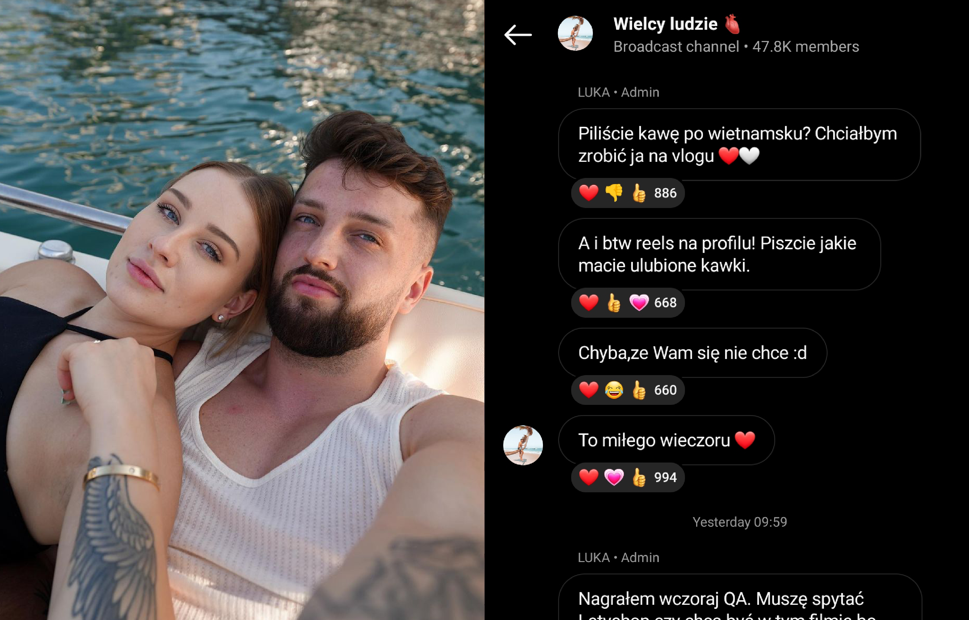 Luka Trochonowicz znany w sieci jako Lucky Luka także zdecydował się na otwarcie swojego kanału nadawczego o nazwie Wielcy ludzie i co więcej, jest tam bardzo aktywny. Influencer bardzo często podkreśla, że rodzina jest dla niego najważniejsza i jak najbardziej można zauważyć to także na podstawie zamieszczanych przez niego treści. Jego Broadcast Channel to połączenie motywacji, inspirujących książek i rodzinnych fotografii, które mają dla niego ogromne znaczenie. Zauważyć też można, że Luka o wiele chętniej wysyła swoim odbiorcom wiadomości głosowe oraz obrazki, niż wiadomości tekstowe. To bardzo dobry zabieg marketingowy, ponieważ jeszcze bardziej zbliża do siebie fanów i twórcę. Jeśli lubicie ciepły i lekko humorystyczny content to na pewno znajdziecie tam dla siebie coś ciekawego.